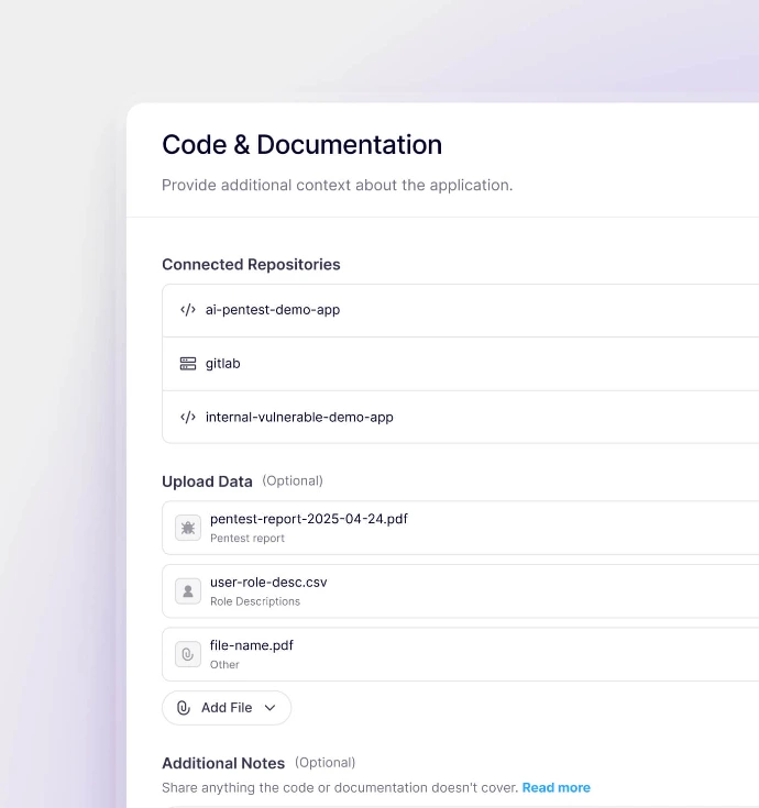 In whitebox mode, it connects to your repository and reads your source code, OpenAPI specs, and route definitions — giving it a deep understanding of your application's structure, authentication logic, and user roles.