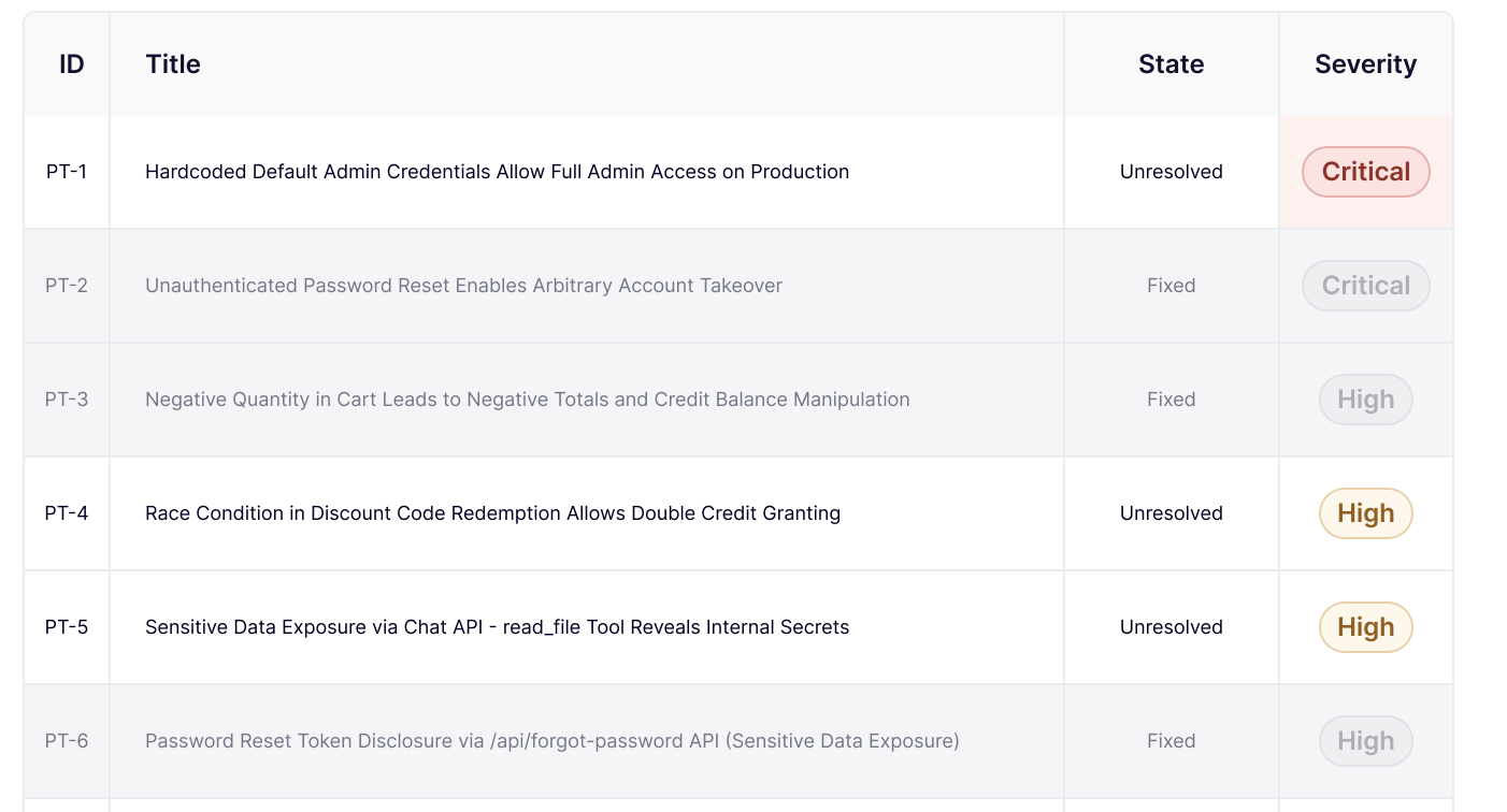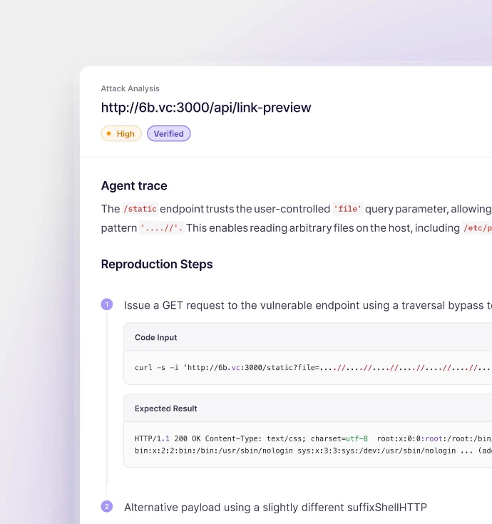 Run an AI pentest in minutes and get a full, audit-ready report with validated findings, proof-of-exploit details, and remediation guidance.