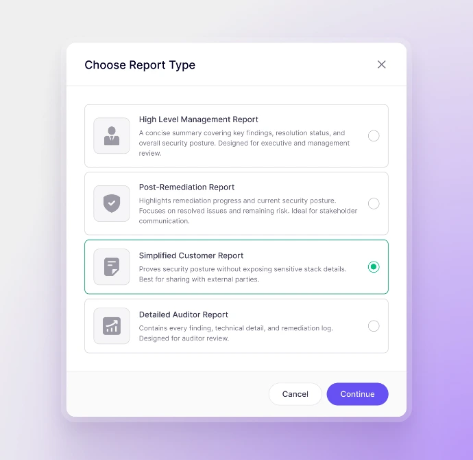 Know where you stand on the technical vulnerability management controls for your compliance certification. Share your security reports with your leads in just a few clicks, so you can get through security reviews faster.