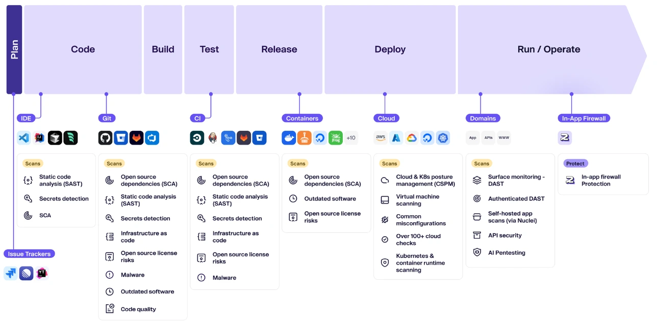 Secure every phase of your Software Development Lifecycle (SDLC) with an integrated approach that covers planning, coding, building, testing, releasing, deploying, and runtime operations. From static code analysis (SAST) and secrets detection in IDEs to open-source dependency and cloud posture management, surface monitoring, and real-time runtime protection, this platform ensures robust security across all stages, preventing vulnerabilities and protecting against critical threats.